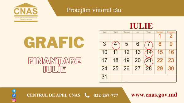 Atenţionăm!!! Începând cu luna iulie finanțarea indemnizațiilor adresate familiilor cu copii, de rând cu indemnizațiile de maternitate (la naştere) şi cele pentru incapacitate temporară de muncă, va fi executată nu o dată pe lună, ci de trei ori - în zilele de 7, 14 şi 21 iulie.