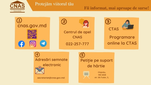 Suplimentar, cetățenii se pot informa cu privire la serviciile publice prestate de CNAS, accesând paginile CNAS pe , și , pot expedia adresări semnate electronic la adresa: , sau pe suport de hârtie - prin intermediul oficiului poştal.
