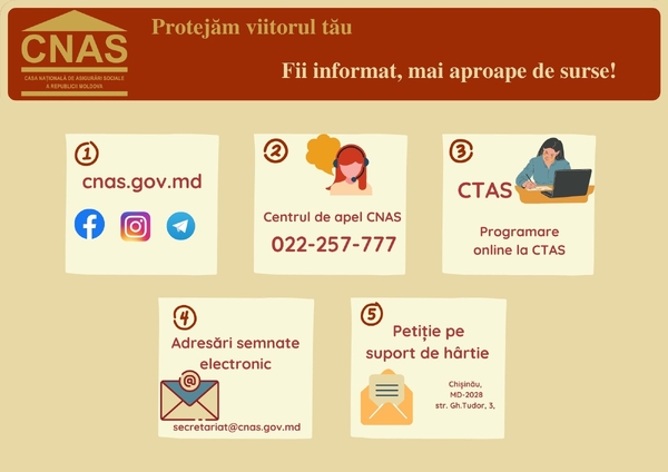 Suplimentar, cetățenii se pot informa cu privire la serviciile publice prestate de CNAS, accesând paginile CNAS pe , și , pot expedia adresări semnate electronic la adresa: , sau pe suport de hârtie - prin intermediul oficiului poştal.