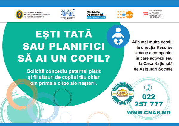 Casa Națională de Asigurări Sociale s-a alăturat campaniei de informare implementate de Fondul ONU pentru Populație (UNFPA Moldova), cu suportul Agenției Austriece pentru Dezvoltare, care are drept scop promovarea concediului paternal în Republica Moldova.