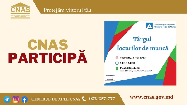 Casa Națională de Asigurări Sociale va participa miercuri, 24 mai, la Târgul locurilor de muncă, care va avea loc în incinta Palatului Republicii (or. Chișinău, str. Maria Cebotari,16), orele 10:00-14:00. Organizatorul evenimentului este Direcţia generală ocuparea forţei de muncă municipiul Chişinău.