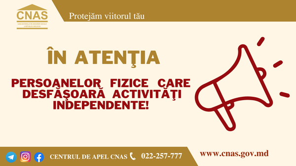 Casa Naţională de Asigurări Sociale aduce la cunoştinţă, că prin Legea nr. 176/2023 pentru modificarea Legii nr. 489/1999 privind sistemul public de asigurări sociale (Monitorul Oficial nr. 237-239 din 13 iulie 2023) au fost operate modificări în partea ce ţine de luarea la evidenţă în calitate de plătitori de contribuţii la bugetul asigurărilor sociale de stat şi de asigurat în sistemul public de asigurări sociale a persoanelor fizice care desfăşoară activităţi independente, precum şi în partea ce ţine de declararea contribuţiilor de asigurări sociale de stat obligatorii de persoanele menţionate.