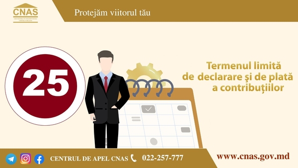 Casa Naţională de Asigurări Sociale reaminteşte, că data de 25 iulie 2023 reprezintă termenul limită de declarare şi de plată a contribuţiilor de asigurări sociale de stat obligatorii la bugetul asigurărilor sociale de stat.