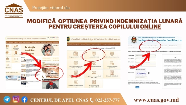 Astfel, pentru modificarea opțiunii a indemnizației lunare pentru creșterea copilului, stabilită din oficiu, beneficiarul poate depune cererea în acest sens la casa teritorială de asigurări sociale sau prin intermediul serviciului electronic ”e-Cerere Indemnizații Familiilor cu copii”, disponibil pe portalul guvernamental unic al serviciilor publice () sau pe pagina-web a Casei Naţionale de Asigurări Sociale (), compartimentul ”Servicii electronice prestate de CNAS” (link-ul: ).