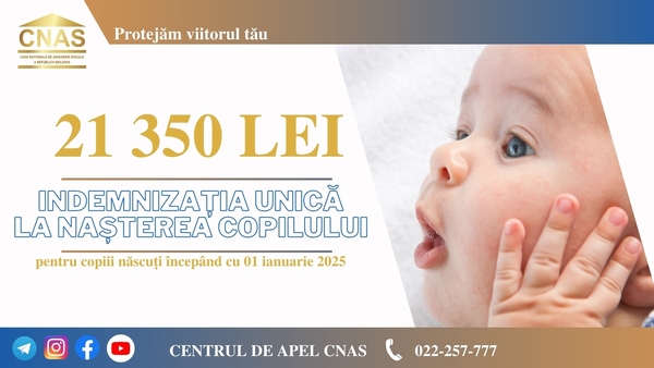 Începând cu 1 ianuarie 2025, au intrat în vigoare modificările operate în cadrul normativ, prin care cuantumul indemnizației unice la nașterea copilului a fost majorat cu 1 350 lei și constituie 21 350 lei.