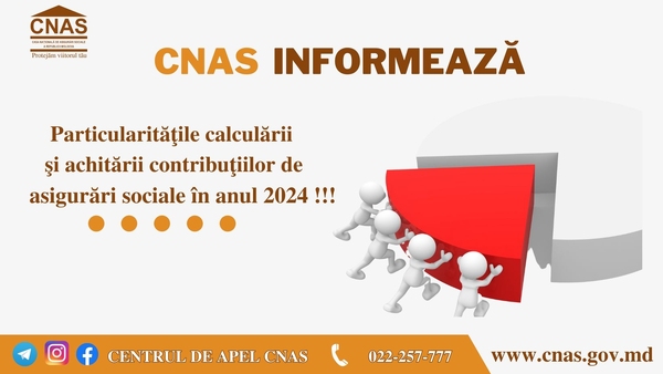 Casa Naţională de Asigurări Sociale aduce la cunoştinţă Particularităţile calculării şi achitării contribuţiilor de asigurări sociale de stat obligatorii în anul 2024, elaborate în temeiul prevederilor Legii nr. 489/1999 privind sistemul public de asigurări sociale şi Legii nr. 419/2023 bugetului asigurărilor sociale de stat pe anul 2024 și în scopul oferirii îndrumării în aplicarea dispoziţiilor legale plătitorilor de contribuţii la bugetul asigurărilor sociale de stat ce decurg din legile prenotate.
