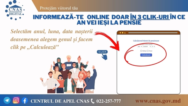 Casa Națională de Asigurări Sociale reamintește tuturor cetățenilor despre serviciul electronic „Calculatorul vârstei de pensionare”, disponibil pe site-ul oficial al instituției (), la secțiunea „Servicii electronice prestate de CNAS”. Acest serviciu permite utilizatorilor să afle anul în care vor putea solicita pensia pentru limită de vârstă.