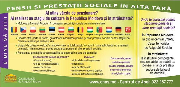 Precizăm, că la momentul actual CNAS aplică 12 acorduri internaționale în domeniul securității sociale, semnate cu următoarele state: România, Portugalia, Bulgaria, Luxemburg, Austria, Estonia, Cehia, Polonia, Ungaria, Belgia, Lituania, Germania, care prevăd aceleaşi tipuri de garanţii sociale pentru lucrătorii şi pensionarii migranţi, ca și pentru cetățenii domiciliați în Republica Moldova.