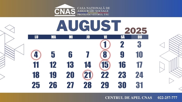 Transferul pentru indemnizațiile unice la nașterea copilului, indemnizațiile pentru creșterea copiilor, indemnizațiile pentru creșterea copiilor gemeni și indemnizațiile paternale vor fi finanțate în zilele de 1, 8, 15 și 21 august. Indemnizațiile pentru incapacitate temporară de muncă și indemnizațiile de maternitate vor fi finanțate în data de 8, 15 și 21 august.