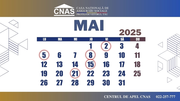 Transferul pentru indemnizațiile unice la nașterea copilului, indemnizațiile pentru creșterea copiilor, indemnizațiile pentru creșterea copiilor gemeni și indemnizațiile paternale vor fi finanțate în zilele de 2, 8, 15 și 21 mai. Indemnizațiile pentru incapacitate temporară de muncă și indemnizațiile de maternitate vor fi finanțate în data de 8, 15 și 21 mai.